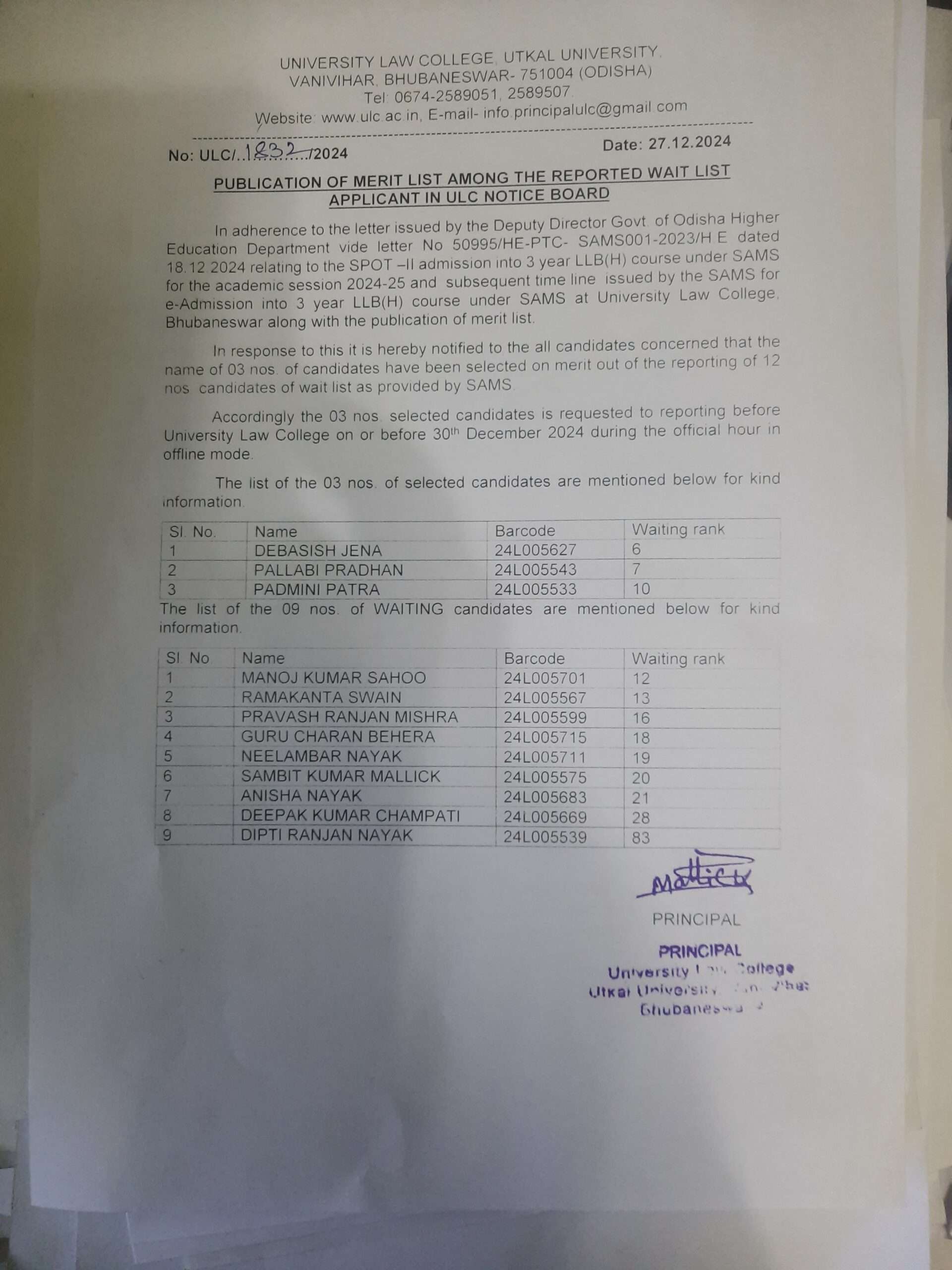Spot II merit list of 3year llb(h) course 2024